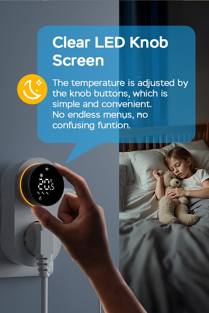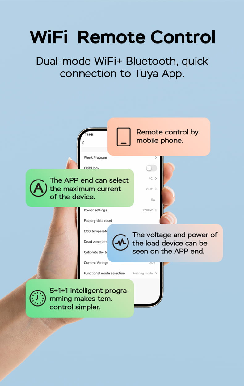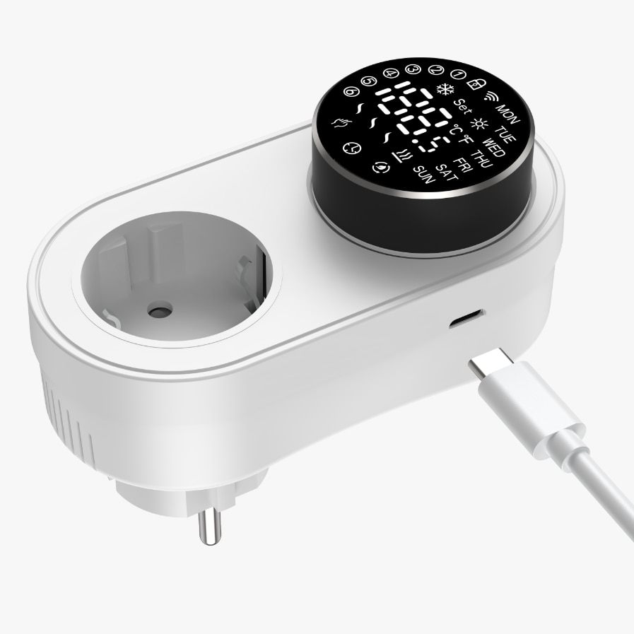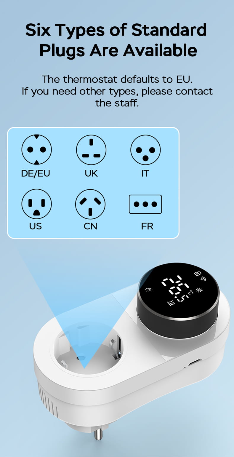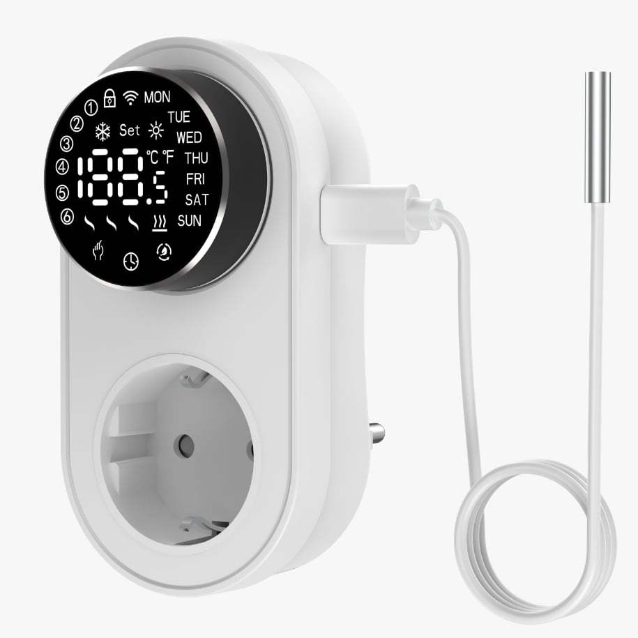 info@minco-heatingcable.comCe thermostat intelligent prend en charge le double mode Wi-Fi et Bluetooth et permet de contrôler la température à distance depuis un téléphone portable, ce qui le rend idéal pour une utilisation à domicile, au bureau ou en magasin. La température se règle facilement grâce à un bouton rotatif. L'écran LED affiche la température en temps réel, le mode de fonctionnement et les notifications push. Il est également doté d'une fonction de verrouillage enfant pour éviter tout contact accidentel avec le thermostat, gage de sécurité et de confort.