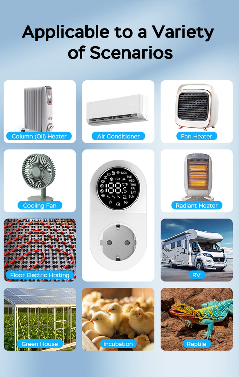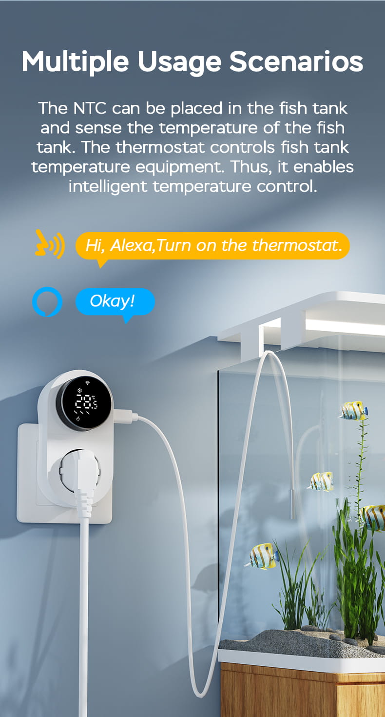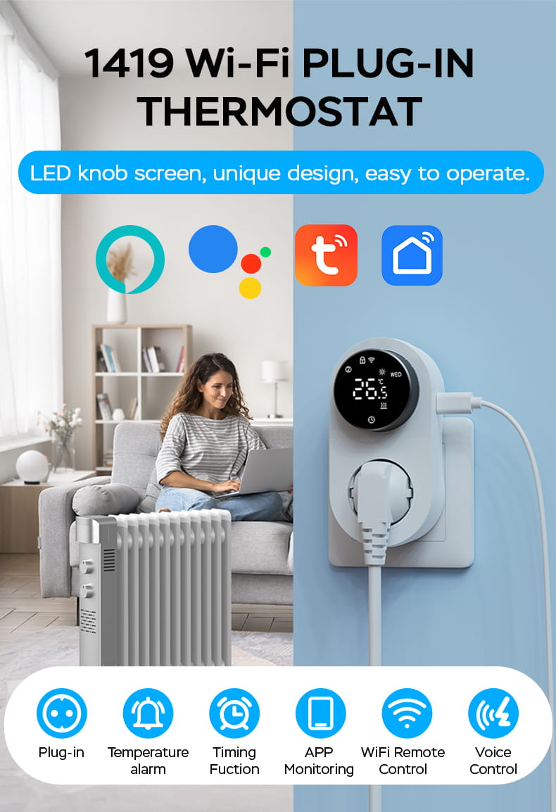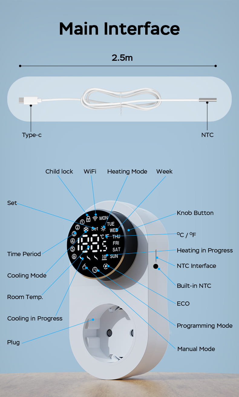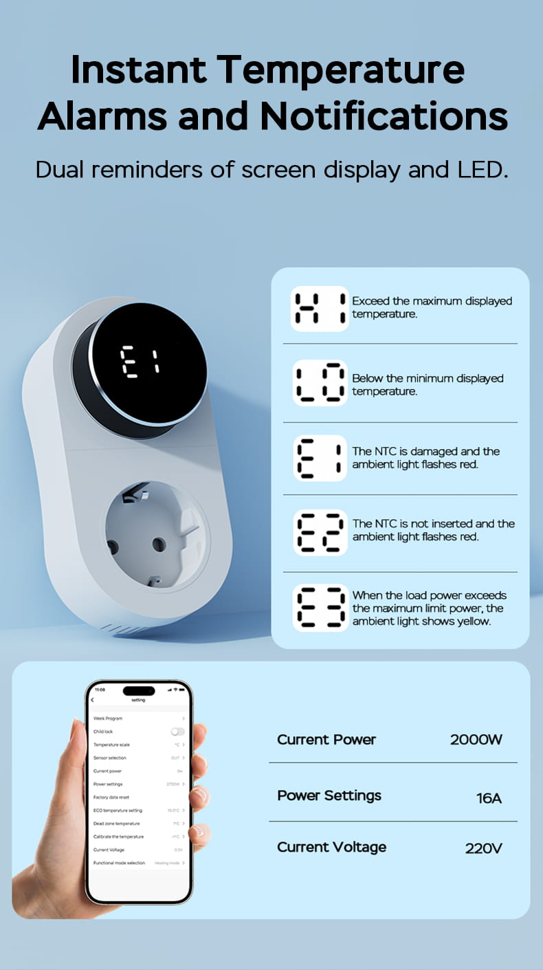 info@minco-heatingcable.comCe thermostat intelligent prend en charge le double mode Wi-Fi et Bluetooth et permet de contrôler la température à distance depuis un téléphone portable, ce qui le rend idéal pour une utilisation à domicile, au bureau ou en magasin. La température se règle facilement grâce à un bouton rotatif. L'écran LED affiche la température en temps réel, le mode de fonctionnement et les notifications push. Il est également doté d'une fonction de verrouillage enfant pour éviter tout contact accidentel avec le thermostat, gage de sécurité et de confort.
